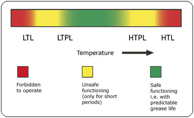 在一个温度范围下可使用什么样的润滑脂主要取决于基础油、稠化剂和添加剂的类型。相关的温度在下表中以“双交通灯”的形式作图解说明。 |