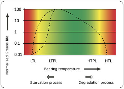 在该极限以下,滚动元件和套圈接触表面的润滑脂供应可能不足。滚子轴承和球轴承的低温性能极限值不相同。